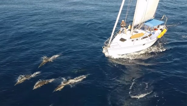 Tijdens een zeiltocht tussen Catalina Island en San Diego filmde Kurt Roll, eigenaar van Low Altitude Films, een grote groep dolfijnen.